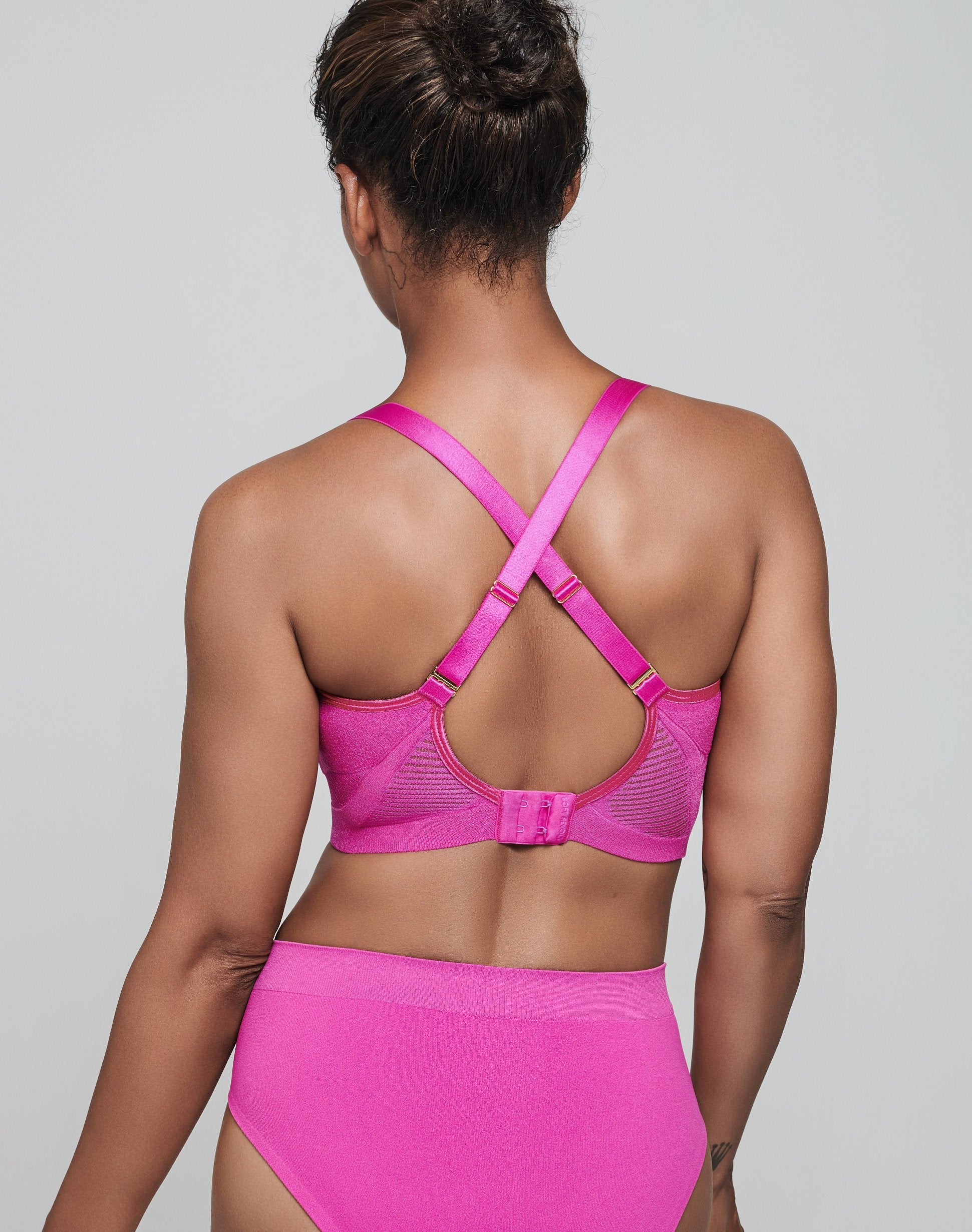The side panel under the armpit is knitted extra firmly, so that it gives a nice streamlined back. The so-called side-boob, armpit lobes or the skin fold that an underwire bra sometimes causes have also disappeared due to the side panel with extra knitted-in support. This knitted-in side support also prevents the breasts from pointing outwards.